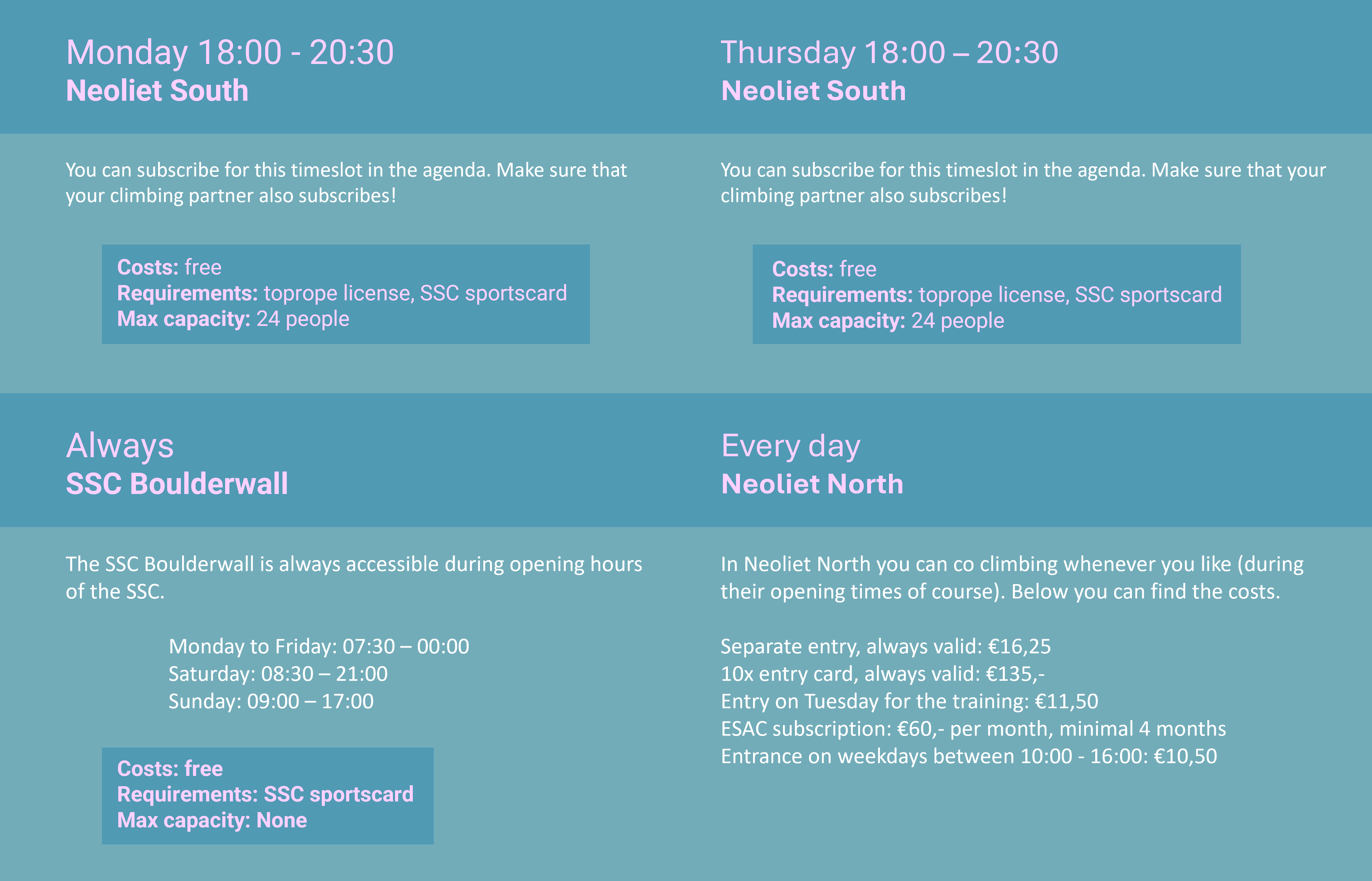 There are also plenty of opportunities for ESAC people to climb outside of organized training courses and climbing weekends. Especially on Mondays and Thursdays, when climbing is extra cheap, chances are that you will bump into other members. In addition to the discounts described below, there are many more discount promotions especially for ESAC members (link discounts and partners).