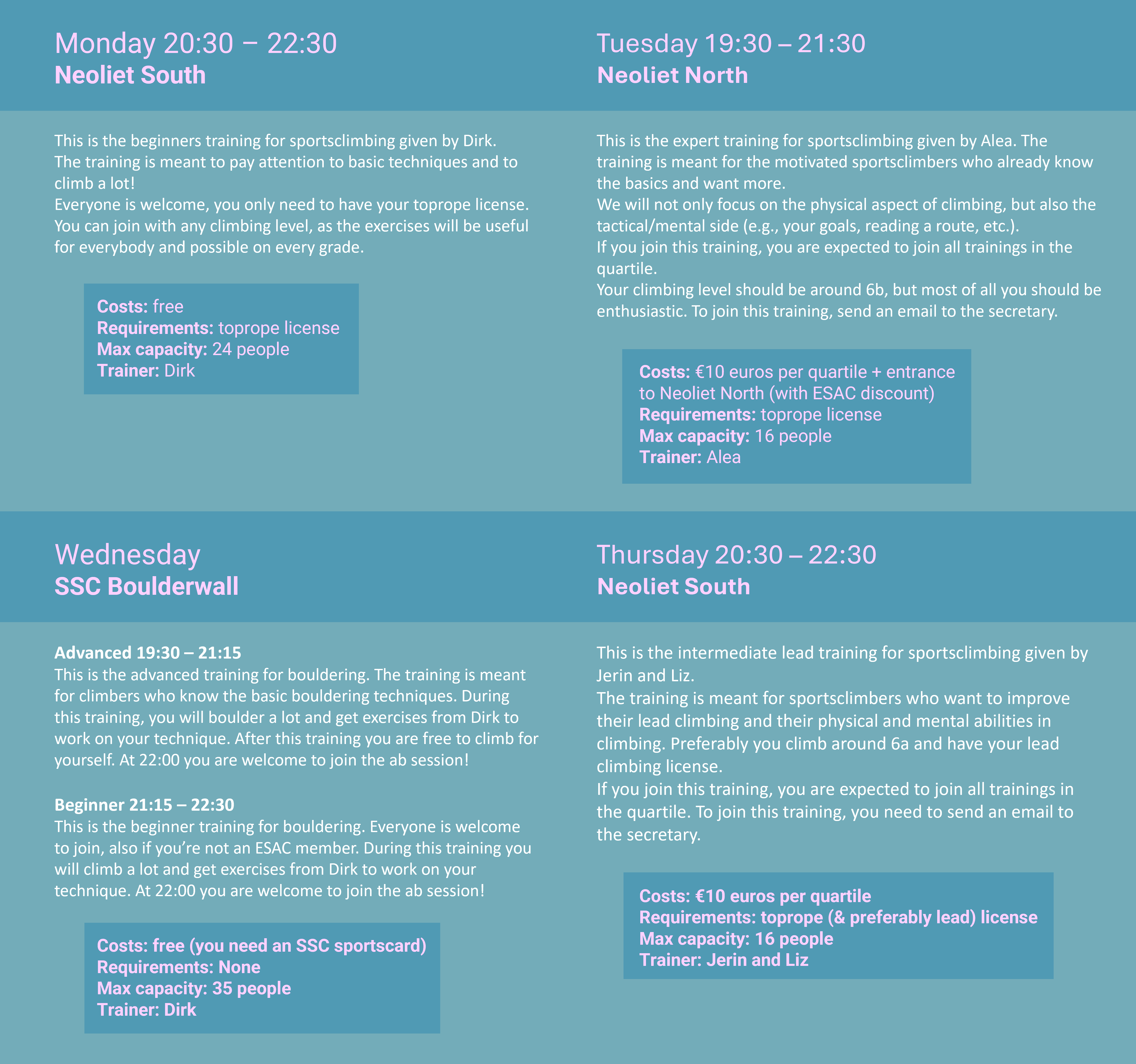 Multiple trainings are given every week, for both beginners and advanced climbers. To participate, you must both be a member of the ESAC and have a sports card. For sport climbing training you must be in possession of a Toprope certificate. This can be obtained at ESAC at the start of the academic year and with the spring intro at the Indoor Toprope course. For more courses see the courses section.