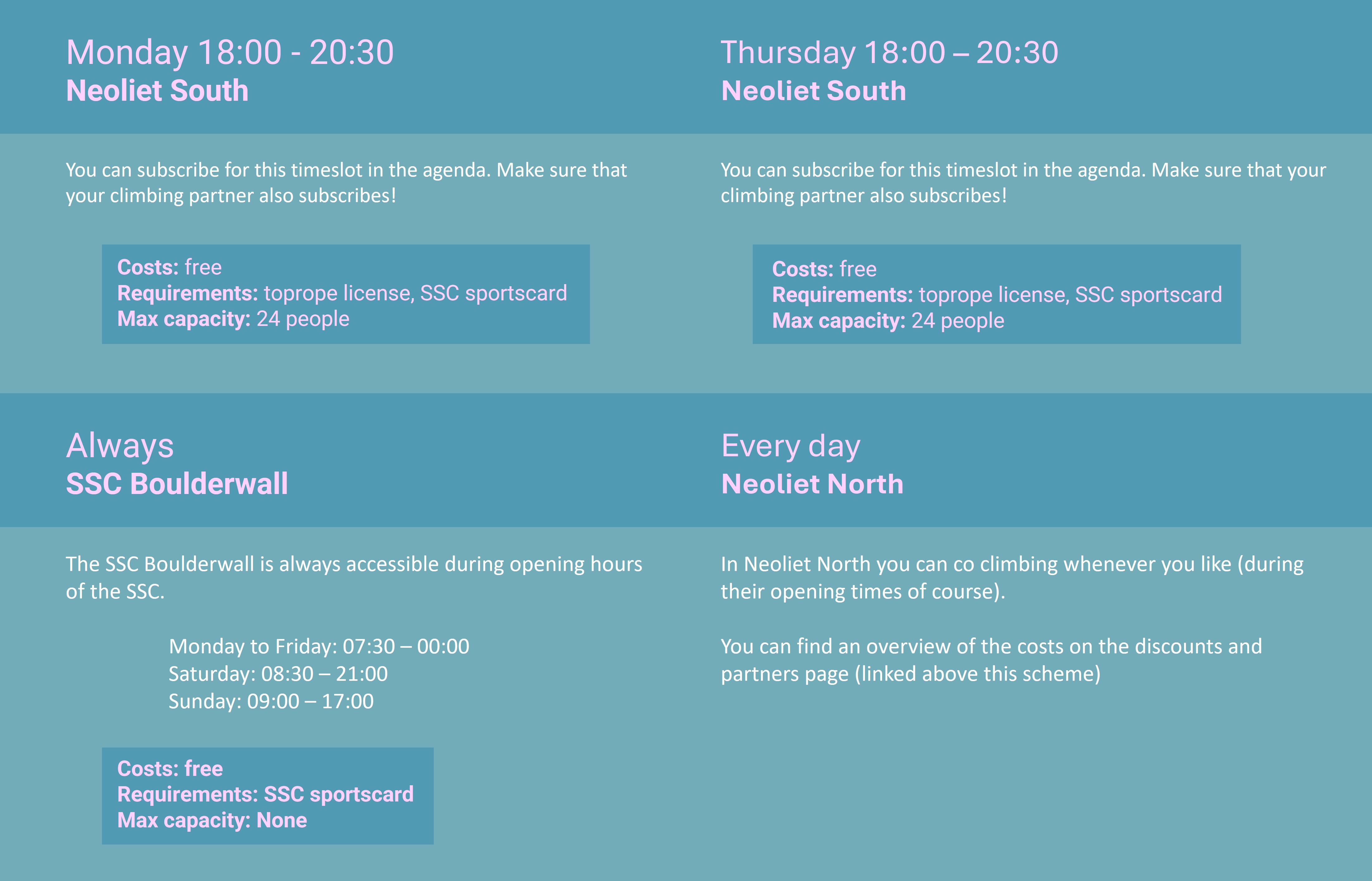 There are also plenty of opportunities for ESAC people to climb outside of organized training timeslots and climbing weekends, especially on Mondays and Thursdays, when climbing in Neoliet South is free. In addition to the discounts described below, there are many more discount promotions especially for ESAC members (link discounts and partners).